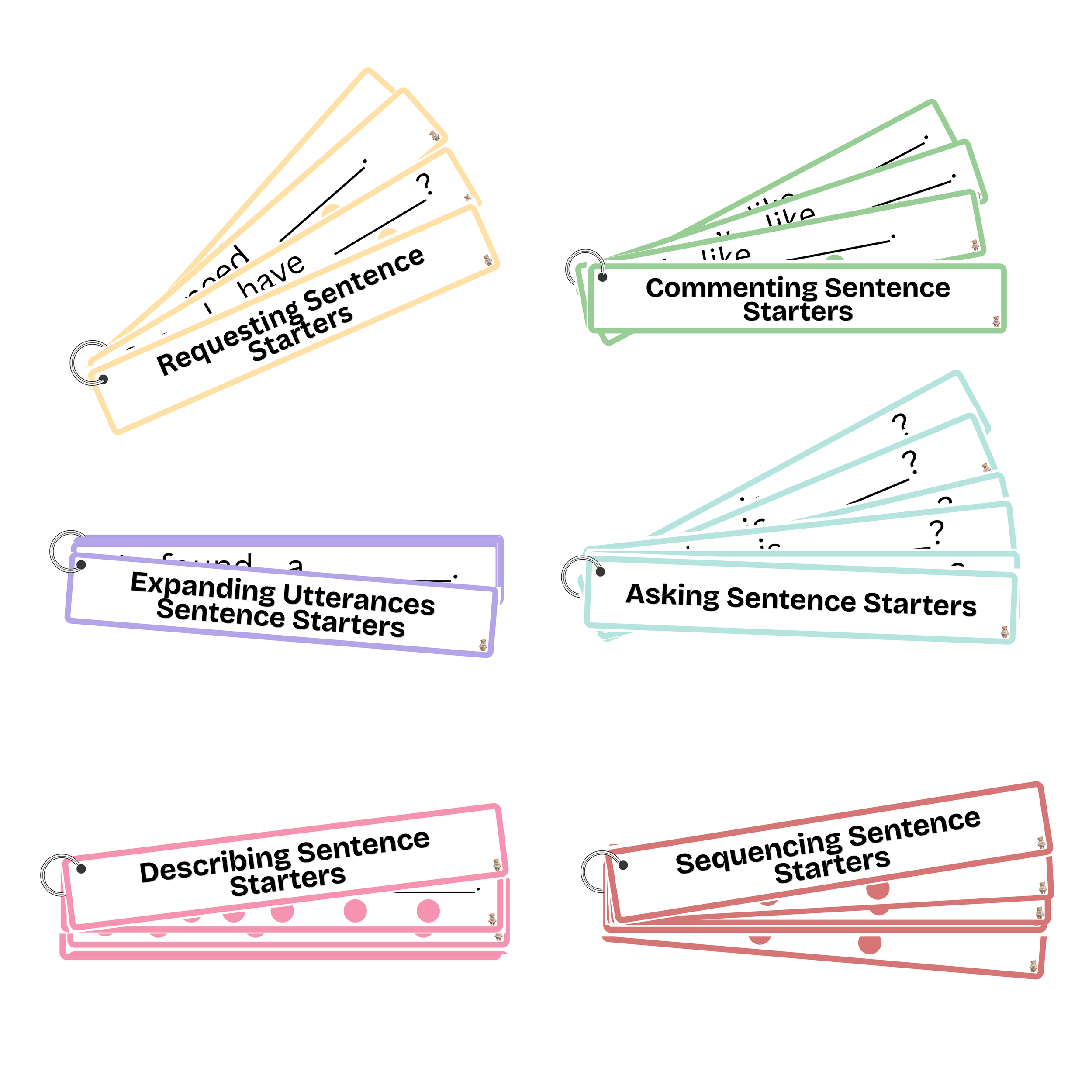 This resource includes a 6-pack set of sentence starters designed to support students in requesting, commenting, asking, describing, expanding utterances, and sequencing. Dots are included under each sentence to guide student tracking and participation, and the strips can be laminated for repeated use with dry-erase markers, promoting independence and ongoing language practice.