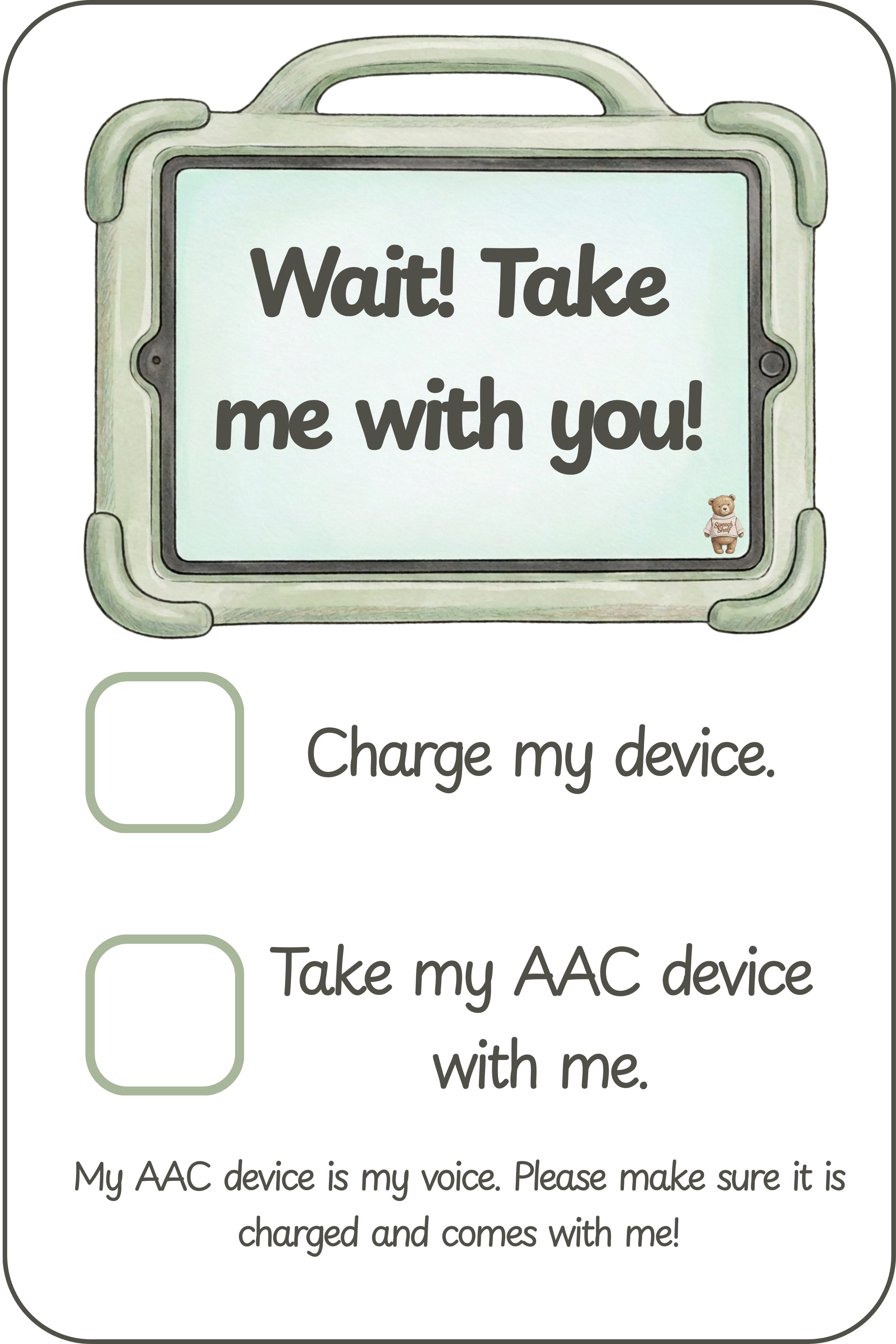 This AAC reminder card helps ensure a client’s communication device is charged and sent with them throughout the day. The visual checklist provides a simple reminder for caregivers or staff to charge the device and bring it along so the client always has access to their voice.