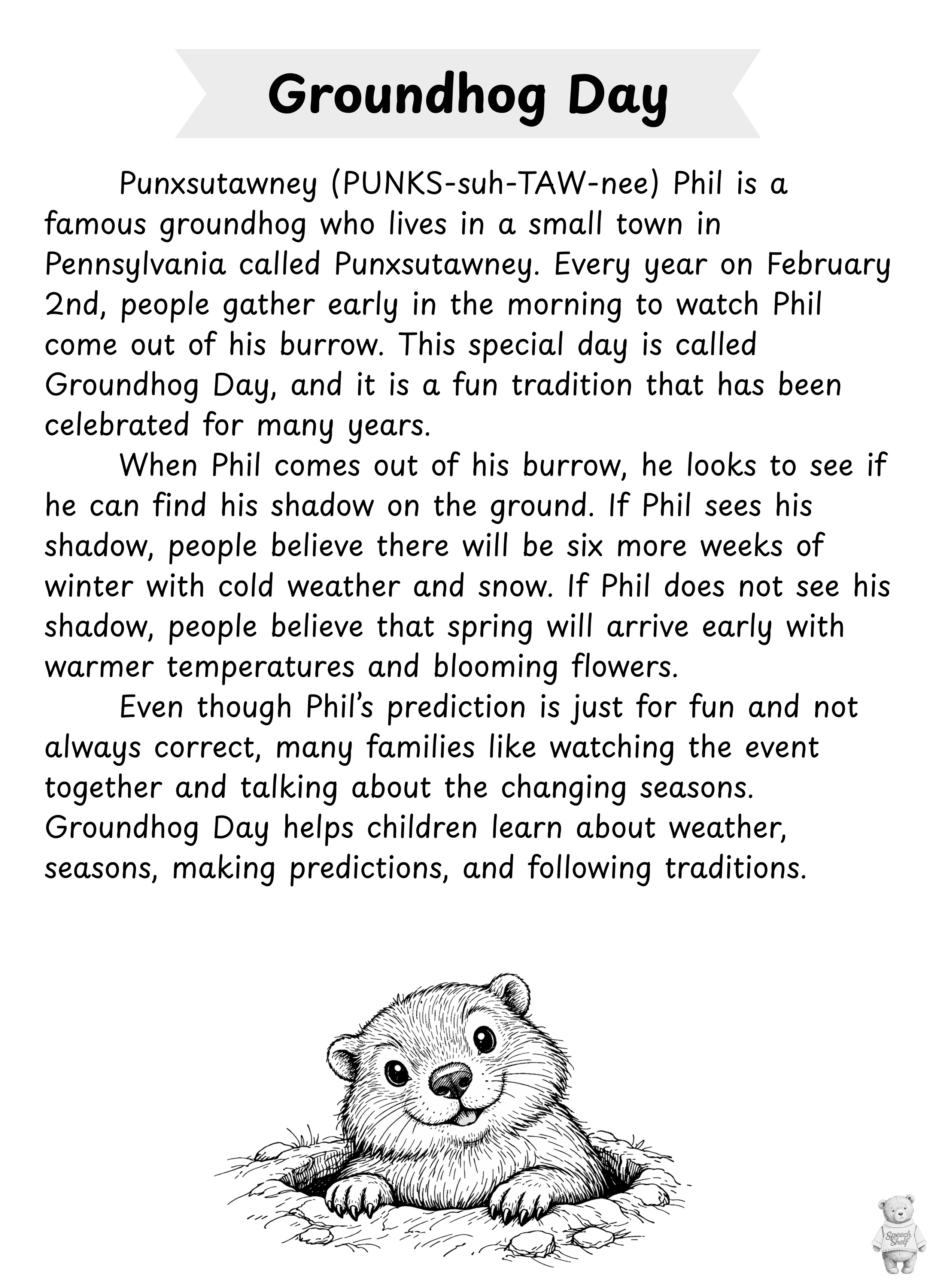 This Groundhog Day resource helps students learn about Punxsutawney Phil through a short reading passage and comprehension questions. Students practice sequencing events, answering questions, and making predictions about whether winter will last longer or spring will arrive early.