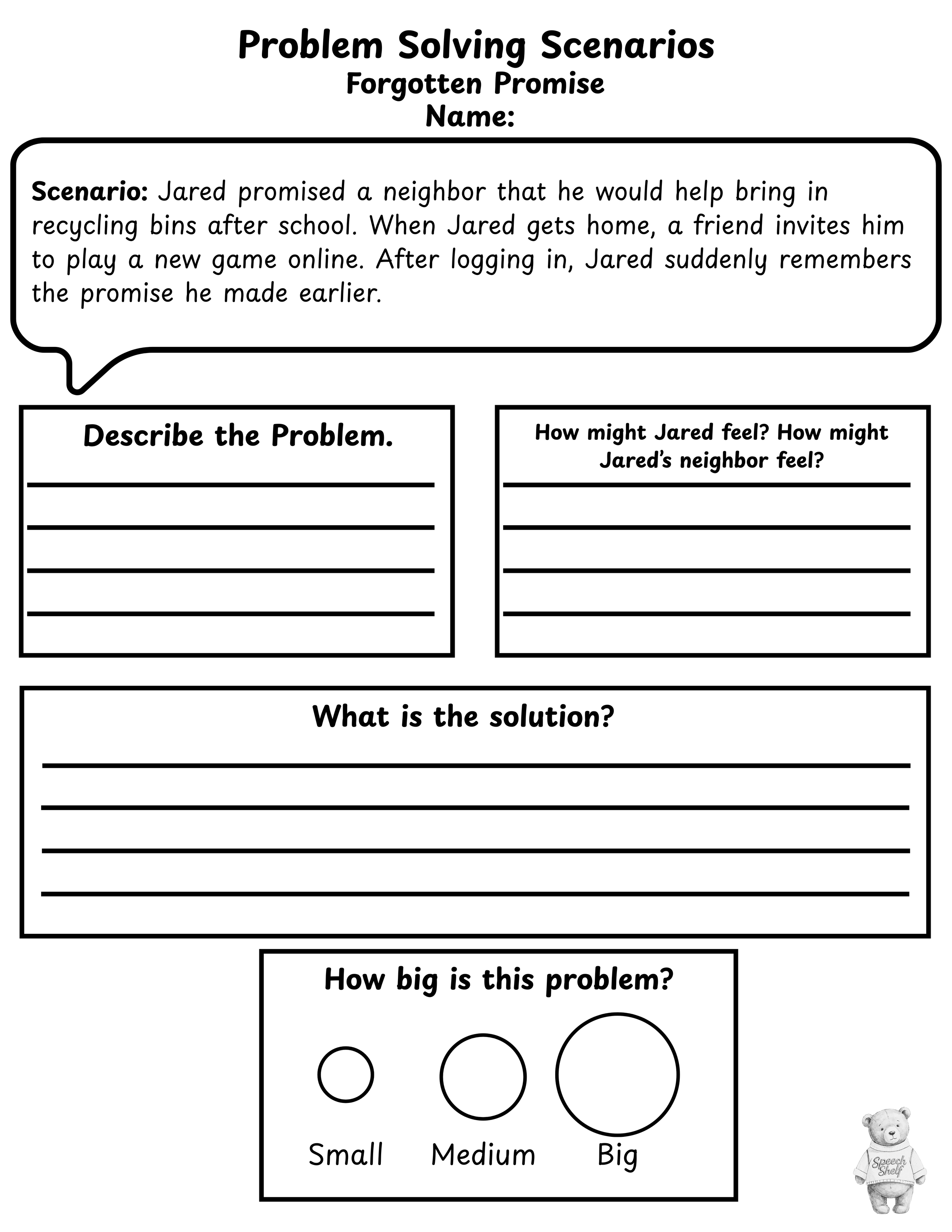 Problem Solving Scenarios helps older students strengthen critical thinking, inferencing, and problem-solving skills through realistic, age-appropriate situations. Students analyze each scenario by identifying the problem, inferring possible emotions, determining the size of the problem, and brainstorming thoughtful solutions.