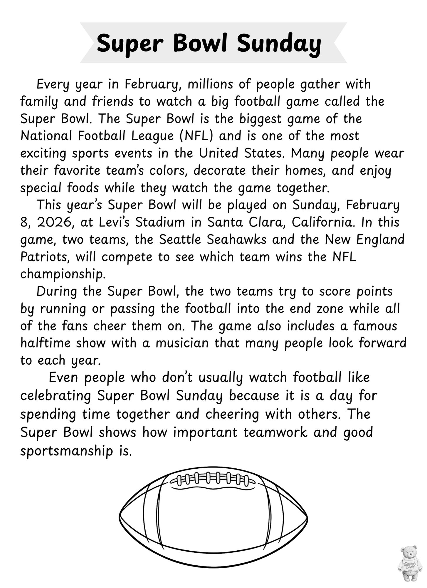 This Super Bowl Sunday resource includes a simple reading passage, comprehension questions, sequencing practice, and a prediction page to support language and literacy skills. Students can learn about the football tradition while working on answering WH questions, ordering events, and explaining their thinking in writing.