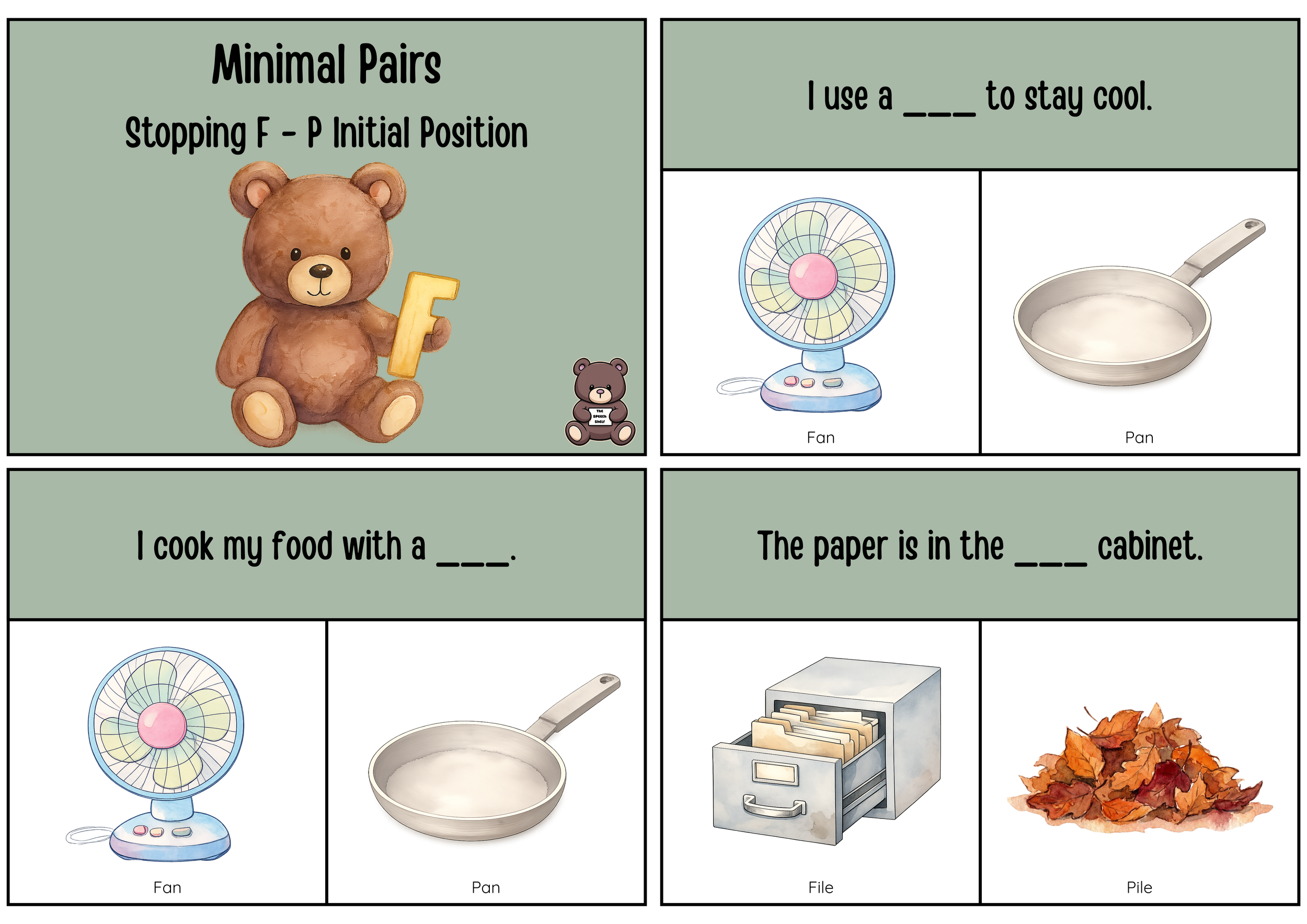 This interactive minimal pairs activity targets stopping of /f/ to /p/ in the initial word position, using high-quality watercolor illustrations to support speech perception and production. Students are presented with picture-supported phrases and must choose the correct minimal-pair target (e.g., fan–pan, file–pile, four–pour, fair–pear, feet–Pete, fin–pin, face–pace, full–pull).