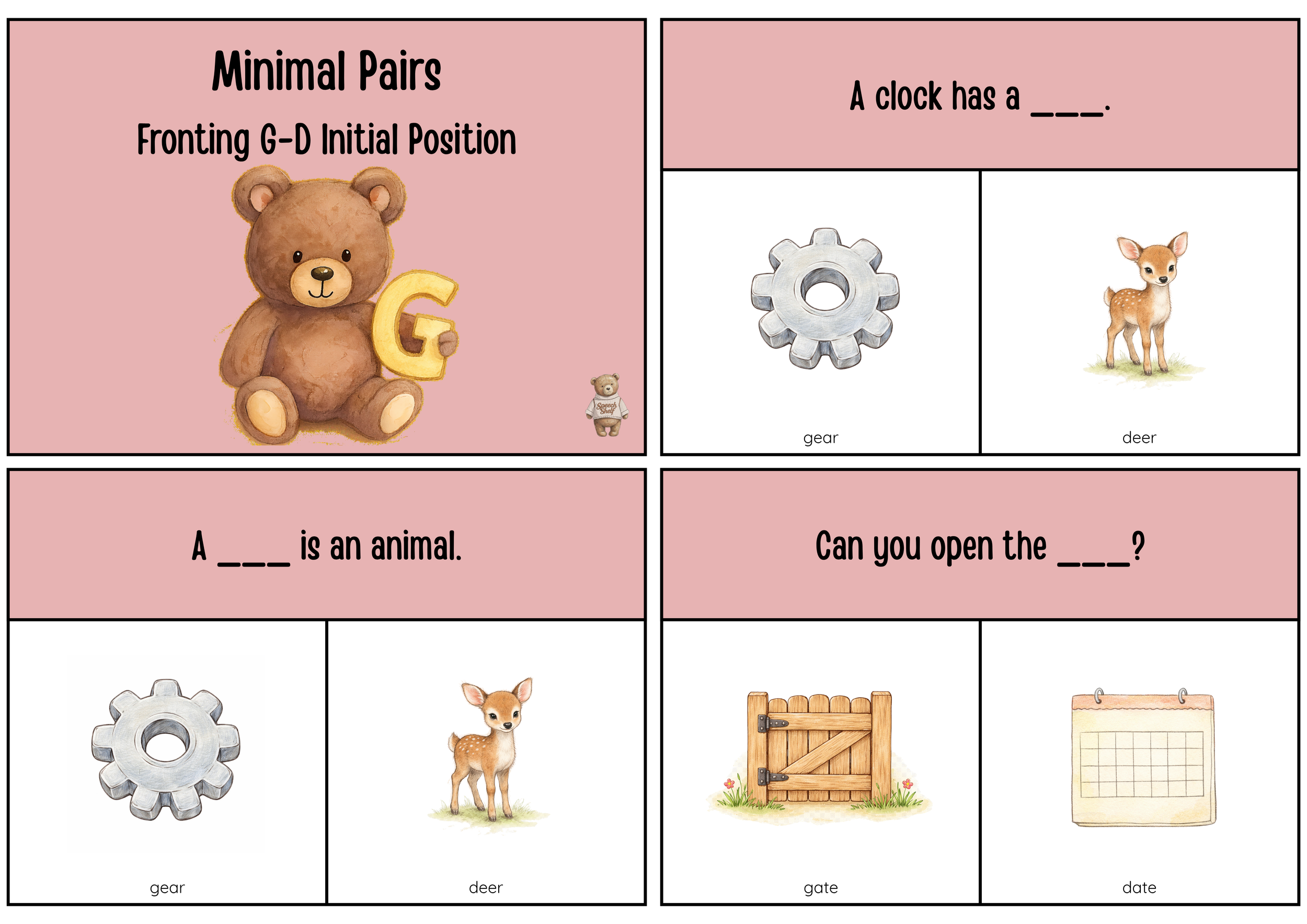This interactive minimal pairs activity targets fronting of /g/ to /d/ in the initial word position, using high-quality, child-friendly illustrations to support speech perception and production. Students are presented with picture-supported sentences and must choose the correct minimal-pair target (e.g., gear–deer, gate–date, go–dough, gull–dull, gown–down, gaze–daze). Each card includes a simple sentence prompt (e.g., “A clock has a ___,” “Can you open the ___?” “Green means ___”).